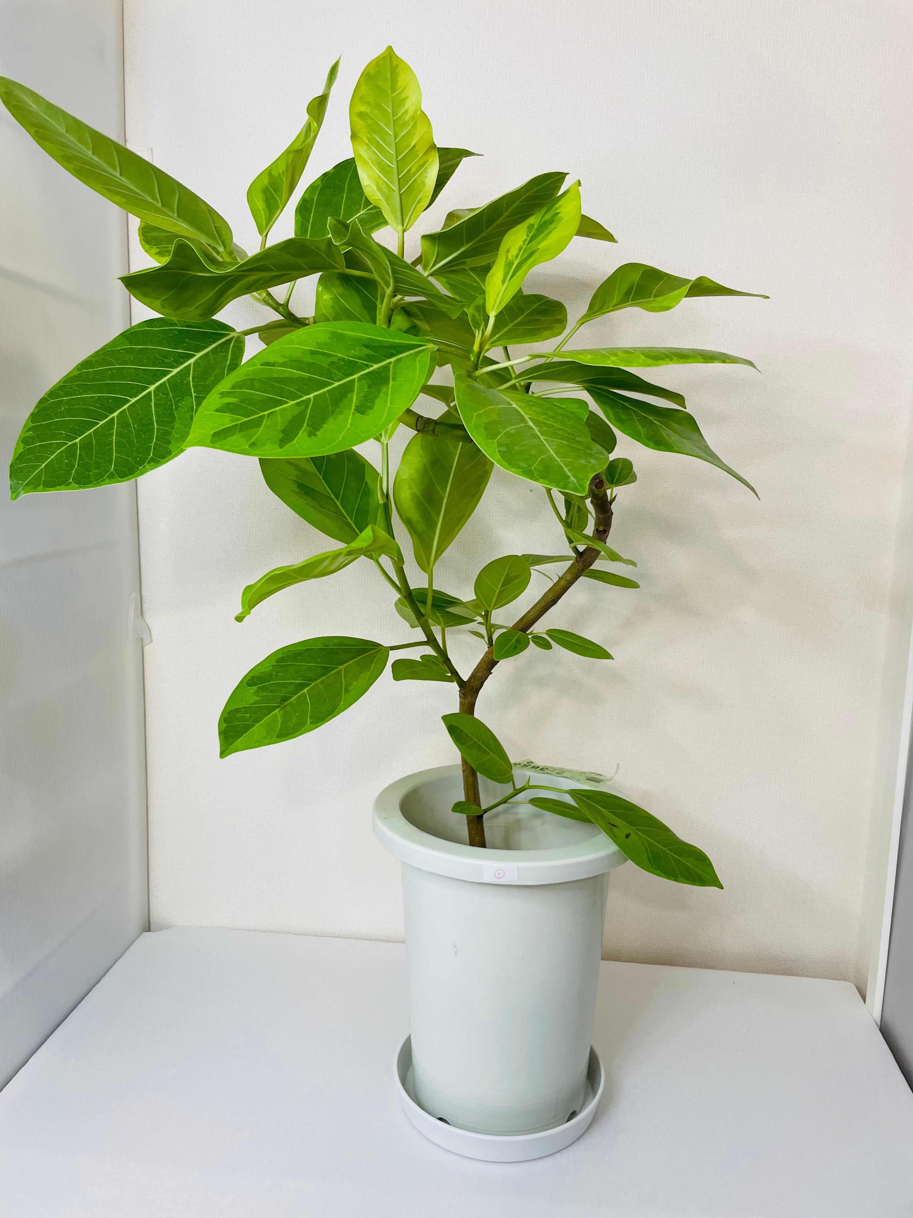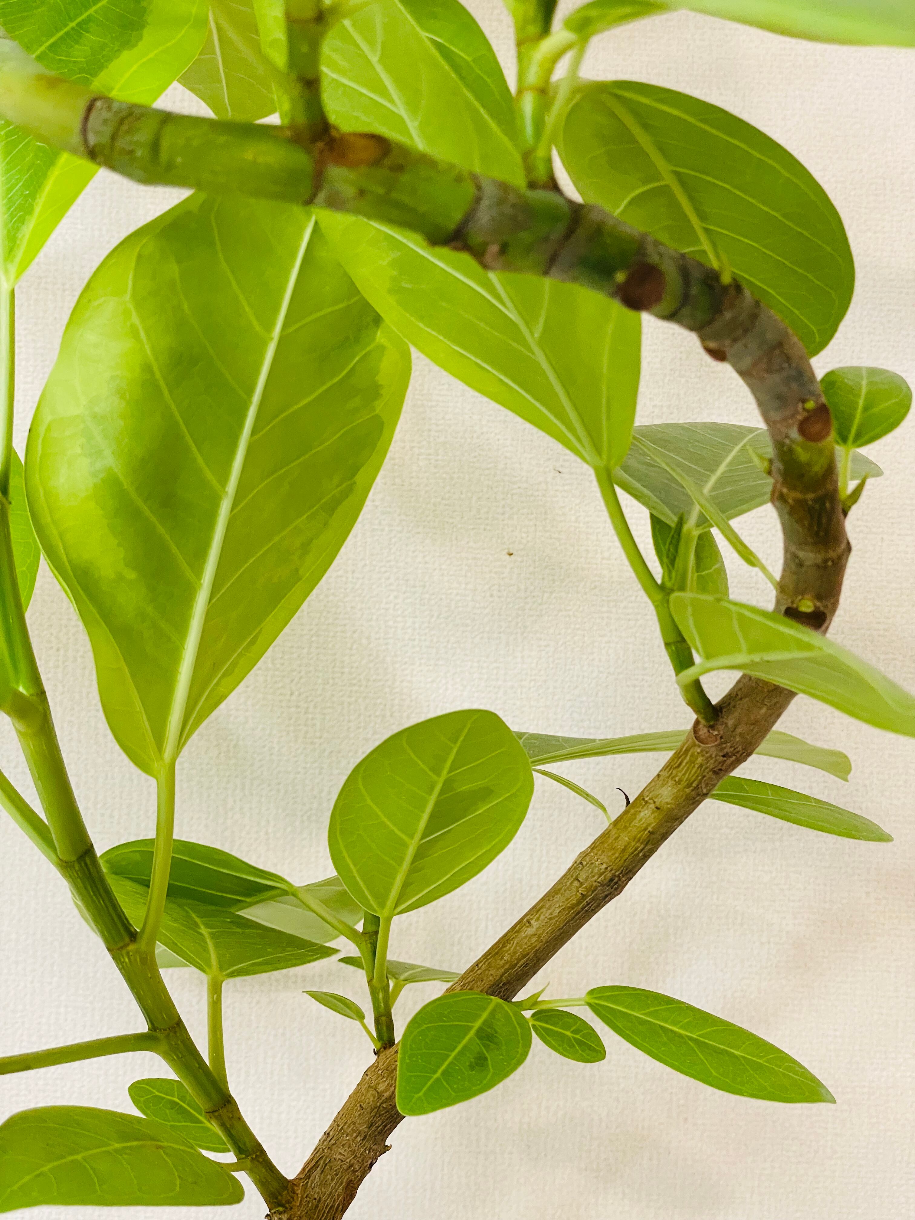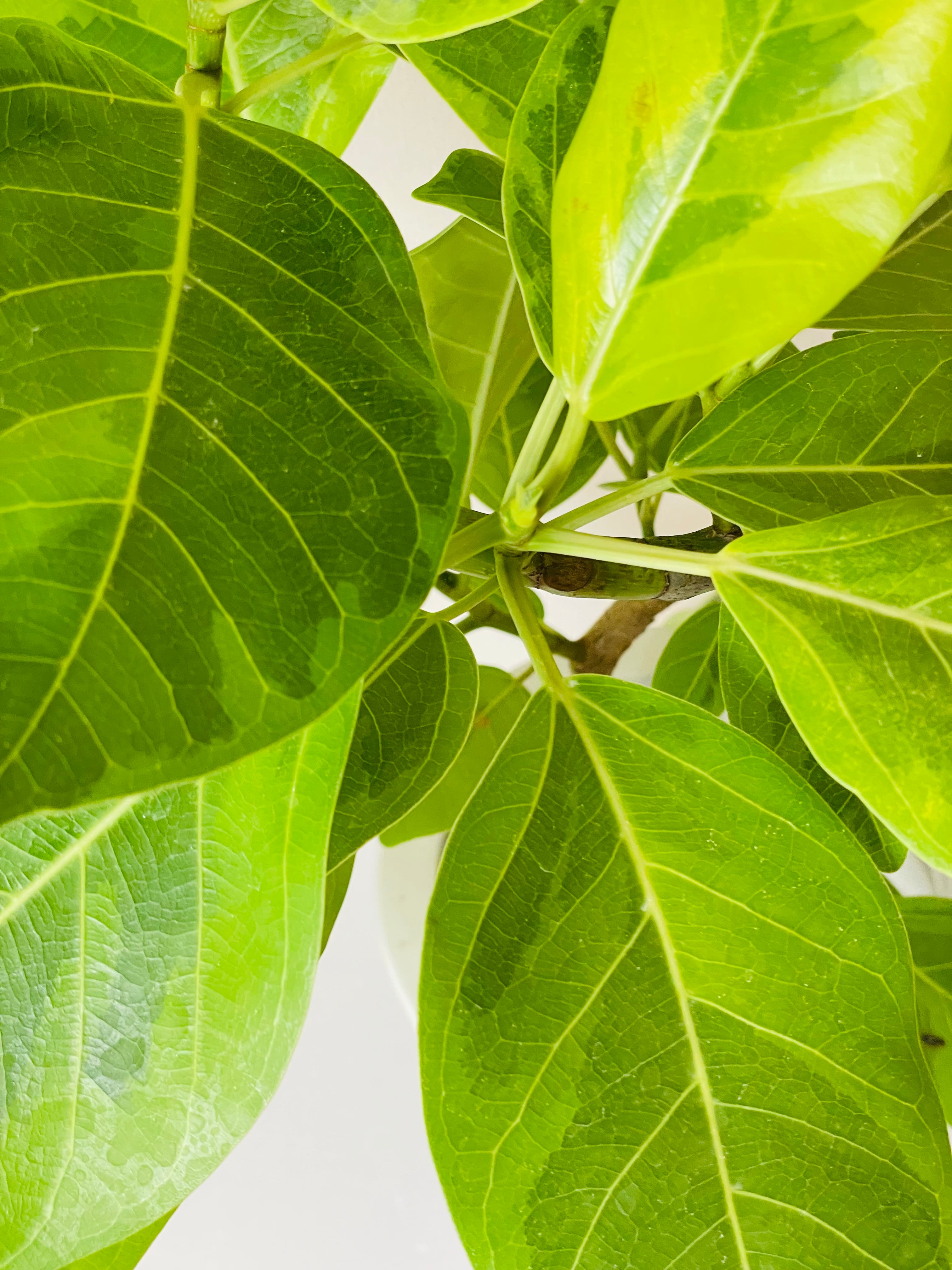 フィカス・アルテシーマ(フィカス・アルテシマ)はゴムの木の仲間で、明るいグリーン~黄色の斑入りの葉が特徴の植物です。種小名であるアルテシーマはラテン語で「最も背が高い」という意味であることからもわかるように、原産地ではかなり大きくなる木です。耐寒性がないため、日本では観葉植物として分類されていますが、大きな鉢に植えると3m近くのサイズになります。一般的に斑入りの品種が多く流通しており、つやがある美しい斑入りの葉はインテリアグリーン、ショップディスプレイなどに利用されとても人気の高い観葉植物のひとつです。